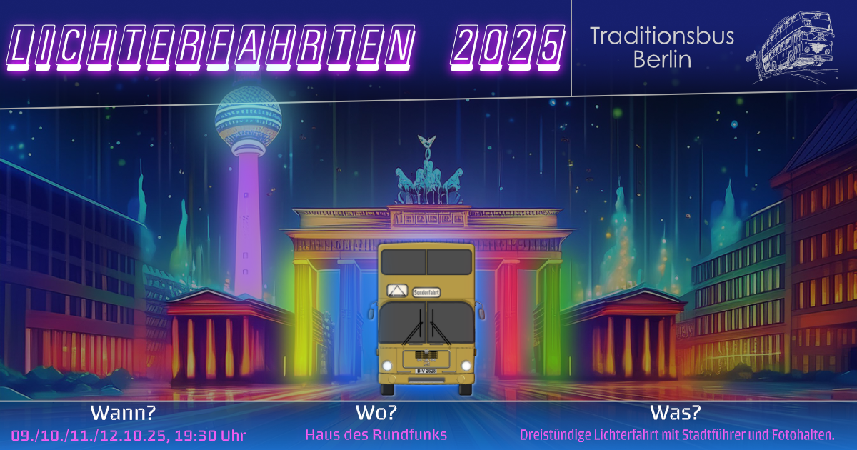 Spät kommt sie, aber nun ist sie da, die Nachricht zur Traditionsfahrt in diesem Jahr. Der 14. September ist das gewählte Datum und Wannsee bis nach Rathaus Zehlendorf der Ort. Wer sich im BVG-Busnetz auskennt hat folglich die Linie 118 erkannt. Hier und auf dem 316er werden wir im 20-Minuten-Takt von 10:00 bis 19:00 mit unseren Auto- und Omnibussen zum VBB-Tarif unterwegs sein.
