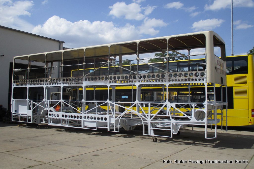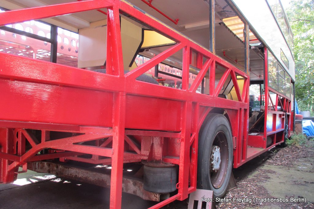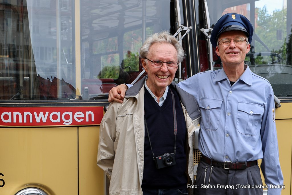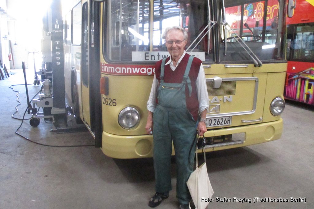 Im August erhielt ich Post von Herrn Podzuweit, die mir ein alter Bekannter bereits angekündigt hatte. Er und Herr Podzuweit befanden sich vor etlichen Jahren im Austausch, als ein umfangreichen Aufsatz über die SD Prototypen 2514 und 2515 entstand. Im Umschlag fand ich eine CD, die an die 200 Seiten Text beinhaltet, die Herr Podzuweit über „seine“ Konstruktion geschrieben hat. Kurzentschlossen rief ich ihn in Dachau, einer Nachbarstadt von München, an. Sein Anliegen war, einen der frühen SD Doppeldecker in Teilen zu vermessen und dokumentieren, um einige kleine Erinnerungslücken schließen zu können. Das war zwei Wochen vor unserer Traditionsfahrt, die am 14. September stattfand. Zu meiner großen Überraschung und Freude teilte mir der 84-jährige mit, er werde die Gelegenheit nutzen und nach Berlin reisen. Ein Hotelzimmer war schnell gebucht und dann trafen wir uns um 11:45 an der Endstelle Rathaus Zehlendorf an unserem SD 74, Wagen 2626. Für mich war und ist es eine große Ehre, bei meinem Dienst mit 2626 den Konstrukteur dieses Busses wiedergesehen zu haben. Er (und ich) strahlte(n) über beide Ohren und das macht ihn mir absolut sympathisch. Er fuhr eine Weile mit und wird sich gedacht haben, meine Mühen haben sich gelohnt – ein guter Bus! Und das 55 Jahre nachdem er seine Arbeit zur Konstruktion der Bodengruppe begonnen hatte.